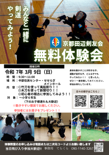 3月9日(日)中部住民センター(せせらぎメインホール)にて、京都田辺剣友会の無料体験会が開催されます。