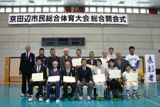 式典では体育協会功労者、府民総体入賞団体およびスポーツ写真コンテスト入賞者の表彰を行いました。