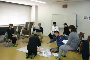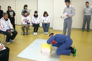 講師に京田辺市消防署員の方に来ていただき、心肺蘇生方法やAED使用方法を教えていただきました。